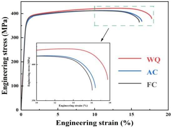 Figure 5 and Table 4 show the engineering stress–strain curves and tensile property results of specimens subjected to varying RRA treatments. It can be seen that the strength and ductility of samples subjected to WQ treatment are the highest. The ultimate tensile strength (UTS), yield strength (YS), and elongation (EL) are 419.2 MPa, 370.2 MPa, and 15.9, respectively. As the retrogression cooling rate decreases from WQ to AC, the UTS, YS, and EL decrease to 408.3 MPa, 356.2 MPa, and 15.0, respectively. When the retrogression cooling rate is further decreased to FC, the tensile properties remain almost unchanged.