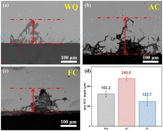 Cross-section SEM images of corrosion samples subjected to RRA treatments with different retrogression cooling ways: (a) WQ; (b) AC; and (c) FC. (d) Statistical findings of mean maximum IGC depth.