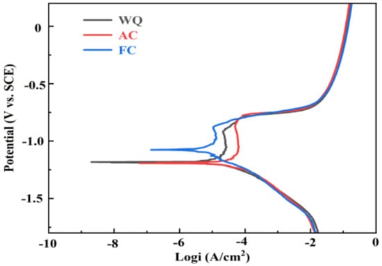 A three-electrode configuration was used for electrochemical tests. The reference electrode, counter electrode, and working electrode are a saturated calomel electrode (SCE, 232-01, Rex Electric Chemical Ltd., Miami, FL, USA), a platinum tablet (SED-75, TOYO Co., Ltd., Tokyo, Japan), and samples with an exposed area of 100 mm2, respectively. Before the test, samples were ground and polished. To ensure a stable state, the open circuit potential (OCP) was recorded for 900 s before the polarization tests. Polarization curves were obtained in a 3.5 wt.% NaCl aqueous solution, ranging from −1.8 V to 0.2 V, with a consistent scan rate of 5 mV/s. Each reported value represents the average of at least three individual measurements.