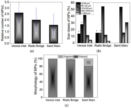 Some images of MPs detected through optical microscopy in the Venice seawaters are shown in Figure S1. Concentrations of 2.6 ± 0.83 MPs/L, 2 ± 1.01 MPs/L, and 1.57 ± 0.91 MPs/L were detected for Venice-Lido port inlet, Rialto Bridge, and Saint Marc water samples, respectively (Figure 3a). No MPs collected from 32 µm to 1 mm mesh sieves were found in negative control. The variance in the occurrence of MPs among the three sites could be associated with the circulation and types of currents prevalent in the Venice Lagoon, described as a large-scale cyclonic meander []. Thus, the Venice-Lido port inlet area showed higher MP abundance compared with Saint Marc and Rialto Bride. It is possible that the stronger currents from the Venice-Lido port inlet act as traps for MPs compared to the Rialto Bridge and Saint Marc sites, while weaker currents, may potentially facilitate the export of MPs. Baini et al. [] also suggested an increase in MP concentration from coastal areas to distant waters. Other authors [] emphasized the potential role of harbors in contributing to MPs in marine environments. We found no statistically significant differences in the MP abundance between the sites (p > 0.05). Among all three sites, the average abundance in the Venice Lagoon was estimated to be 2.06 ± 1.59 MPs/L.