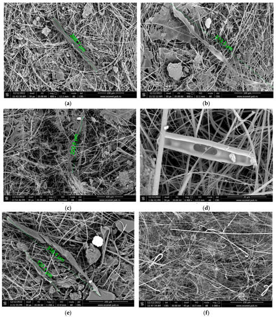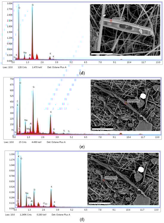 The EDX composition of micro-fragments from Figure 6a–c,e,f are compatible with the chemistry of common plastic marine litter. A higher amount of oxygen may be related to PET [], while higher amounts of Si could suggest the presence of silicon-based MPs even if the silicon from the glass fiber filter may interfere. The object with the highest amount of silicon (33.07 wt.%) and no carbon is a diatom (Figure 6d). Diatoms, also known as Bacillariophyceae, have a significant contribution to aquatic ecosystems by converting dissolved carbon dioxide into oxygen [,].
