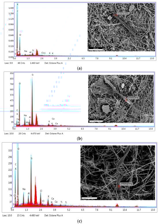 The primary constituents for micro-fragments detected in Venice-Lido port inlet (Figure 6a,b) and Grand Canal at the Rialto Bridge water samples (Figure 6c) are carbon 16.45–62.83 wt. % and oxygen 32.51–47.78 wt.%. The micro-fragments detected in the Saint Marc basin water sample (Figure 6e,f) are characterized by 31.01–41.85 wt.% carbon, 42.32–39.28 wt.% oxygen, and 3.69–9.83 wt.% silicon.