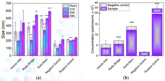 Size (a) and concentration of nanoparticles (b) measured for seawater samples collected from the Venice Lagoon. D10, D50, and D90 values indicate the percentage of particles under the specific size. * p < 0.05, ** p < 0.01, and *** p < 0.001.