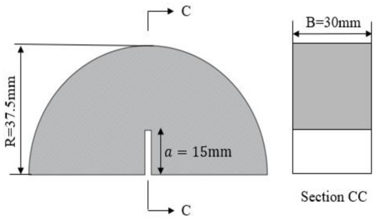 The schematic diagram of the NSCB sample size recommended by the ISRM was utilized to measure the Type I static fracture toughness, as depicted in Figure 2.