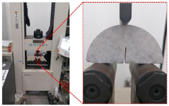 - Three-point bending experiments were conducted using NSBN specimens, following the experimental procedures described in the references [8,29]. The loading rate employed was 0.1 mm/min, and the loading method is illustrated in Figure 3.