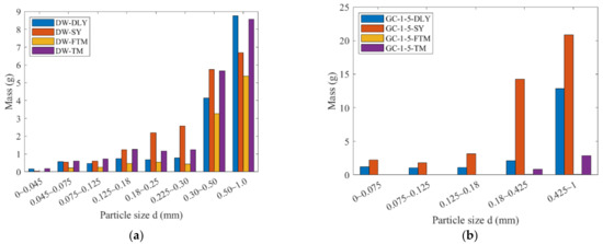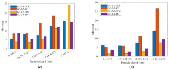 The mass of each particle size under the sieve: (a) DW-5; (b) GC-1-5; (c) GC-2-5; (d) GC-2-2.
