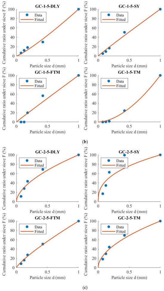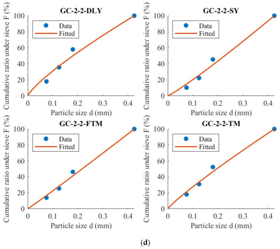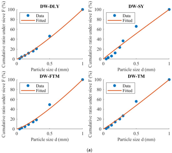 Equation (17) is utilized to fit the mass distribution under the sieve under various conditions, and the results are depicted in Figure 5. The fitting outcomes and coefficient of determination (R2) are summarized in Table 4.