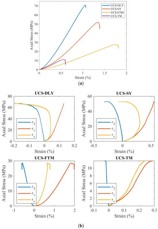 The uniaxial compressive strength of coal and rock was experimentally determined using the AG–250 kN-IS testing machine. Strain gauges were employed to measure the deformation of coal and rock during uniaxial compression, where represents longitudinal deformation; represents transverse deformation; and represents volumetric strain. The stress–strain curve measured is depicted in Figure 6. Based on the figure, the elastic modulus, Poisson’s ratio and peak strength of the four coal rocks can be inferred.