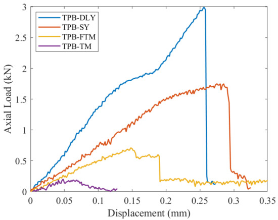 Three-point bending fracture experiments were conducted on marble, sandstone, non-outburst raw coal and outburst raw coal. The load–displacement relationship of the NSCB specimen is depicted in Figure 7.