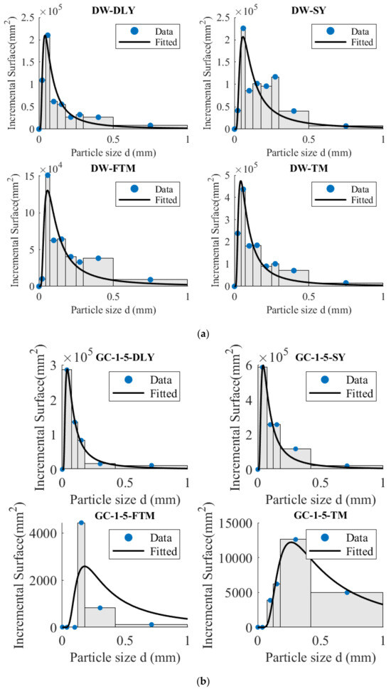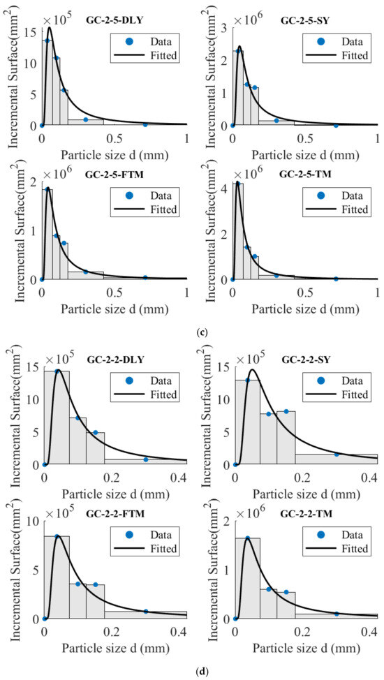 Equation (9) was utilized to calculate the newly added surface area, while Equation (20) was employed to fit the newly added surface area. The distribution of the new area after the coal and rock particles are subjected to hammer drop and grinding is illustrated in Figure 9, with the fitting parameters presented in Table 6. The results demonstrate that Equation (20) adeptly captures the relationship between the newly added surface areas.