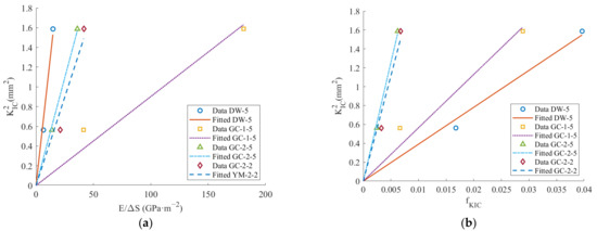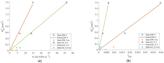 Figure 10 illustrates that the ratio of the square of the elastic modulus to the fracture toughness is consistent with a linear relationship with the newly added surface area. Moreover, the square of the fracture toughness is also proportional to . The fitting parameters of Equations (4) and (14) are presented in Table 7.