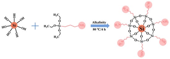 The preparation of ANS was carried out using the process mentioned in Figure 1. Initially, 5 g of NS was uniformly dispersed in a mixed solution of ethanol and water through ultrasonic treatment. Then, 2.5 g of APTES was added to the above mixture, and its pH was adjusted to alkaline using ammonia. The aminated nano-silica, denoted as ANS, was obtained through a reaction at 80 °C for 4 h.