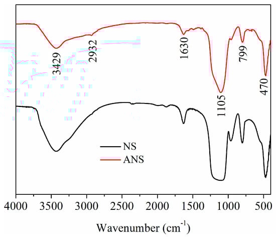 Figure 2 presents the FT-IR curves of NS and ANS. The Si-OH vibration near 1630 cm−1, and the Si-O-Si vibration peaks at 799 cm−1, 470 cm−1 and 1105 cm−1 were reflected in the curves [49]. Clearly, ANS retained the characteristic peaks of the silica framework. In comparison, the O-H absorption peak around 3429 cm−1 significantly weakened, while a stretching vibration absorption peak of C-H bonds appeared at 2932 cm−1. This suggested that the silane-coupling agent APTES had reacted the Si-OH groups [50], successfully bonding to the surface of NS particles.