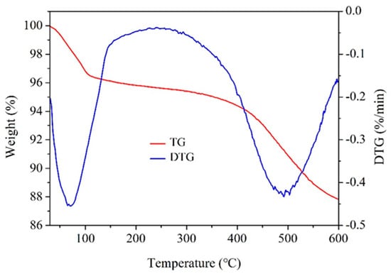 Due to the commonly encountered high-temperature conditions in geological formations, the drilling fluids must withstand elevated temperatures. Otherwise, they cannot perform effectively. Therefore, it is essential to investigate the thermal stability of ANS. Figure 3 illustrates the TG and DTG curves of ANS. In the initial stage, there was approximately a 4% weight loss below 120 °C, attributed to solvent evaporation. The weight only slightly decreased as the temperature increased to the 120–400 °C range. Around 400 °C, the TG curve sharply declined, indicating the thermal degradation of functional groups on the silica surface. In addition, the DTG curve also confirmed that there was significant thermal decomposition due to solvent evaporation in the first stage, but the maximum thermal decomposition occurred around 490 °C. Therefore, ANS exhibited excellent thermal stability, a crucial property for water-based drilling fluids that needed to withstand high temperatures during the drilling process.