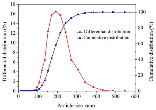 Shale belongs to dense rocks with unique pore structure characteristics. The optimal performance of the dense plugging is achieved when the particle size of the shale stabilizers matches the pore dimensions of the shale. Therefore, it is necessary to investigate whether the particle size distribution of ANS corresponds to the micro-nano pore sizes in shale. Figure 4 depicts the PST curves of ANS. The average size of ANS was 183.58 nm, with a particle size distribution ranging from 85.01 to 433.11 nm. This size range corresponded well with the dimensions of shale pores and cracks, facilitating efficient plugging.