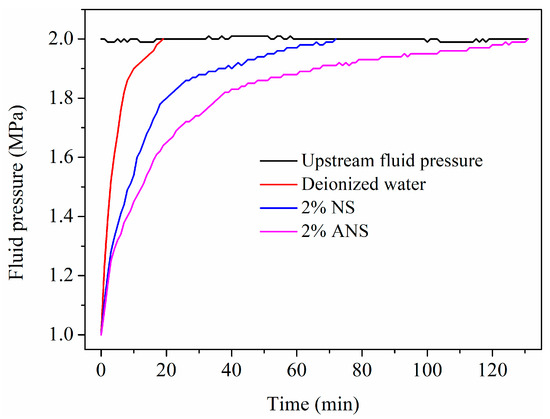 Nanoparticles are widely employed in shale plugging due to their size compatibility with shale. Pressure penetration tests can simulate the process of nanoparticles invading shale pores and cracks [51]. Therefore, this method has become a crucial approach for studying the effectiveness of nano-sized plugging agents. The test fluids can be pumped into the shale through upstream pressure. If they exhibit strong plugging performance, the pressure penetration rate will be slow, requiring more time for downstream pressure to balance with upstream pressure. If their effectiveness is limited, a plugging structure will not form on the shale surface, leading to a rapid pressure penetration rate. Accordingly, the pressure equilibrium will be achieved in a very short period of time. Figure 5 shows the pressure penetration curves for different test fluids. It reached an upstream pressure in 19 min within deionized water, indicating a rapid penetration into shale. The pores and cracks in the shale served as the main pathways for fluid flow. In the absence of any treatment agents, fluids could easily penetrate into the subsurface through these channels. Therefore, under conditions with a pressure differential, downstream pressure increased rapidly. Pressure equilibrium was achieved in a very short period given the ease of fluid movement along these pathways. However, after adding nanoparticles, the pressure penetration rates were significantly slowed down. For NS and ANS, it took 72 and 131 min, respectively, to reach upstream pressure. Due to the size compatibility of nanoparticles with shale pores, they could penetrate the interior of shale, densely accumulate, and form a plugging layer. Consequently, in this test, nanoparticles exhibited a pronounced plugging effect. For NS, the pressure penetration equilibrium time was 3.79 times longer than that of the control sample. Surprisingly, for ANS it increased to 6.89 times. Particularly, ANS demonstrated stronger plugging performance, mainly attributed to the modification of the silica surface using APTES, allowing the amine groups to adsorb more tightly on the shale surface, resulting in a denser plugging layer [52]. It was more effective in retarding pore pressure penetration. This confirmed that ANS was a shale stabilizer with stronger plugging performance, exhibiting a significant effect in impeding pore pressure penetration.