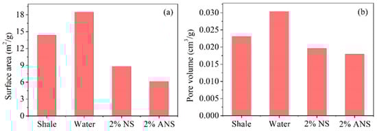 The changes in the microstructure of shale after the exposure to various test fluids are crucial indicators of its plugging performance. Figure 6 shows the test results of surface area and pore volume of shale after immersion in different test fluids. The initial surface area of the shale was 14.36 m2/g. After immersion in deionized water, it increased to 18.45 m2/g. The clay particles on the surface of shale exhibited a high affinity for adsorbing water. Upon contact with water-based fluids, the clay surfaces adsorbed a significant amount of water, generating substantial swelling pressure that led to the expansion of fractures. Clearly, the increase in surface area after exposure to water was mainly attributed to the hydration effect, resulting in wider pores and cracks [53,54]. Subsequently, after the immersion in NS and ANS, the surface area decreased to 8.79 and 6.12 m2/g, respectively. This indicated that both NS and ANS could enter shale pores and cracks to play a plugging role. On one hand, nanoparticles could penetrate shale pores and cracks, forming plugging structures that reduce water infiltration. Consequently, the expansion pressure generated by hydration was diminished. On the other hand, nanoparticles could adsorb onto clay surfaces, contributing significantly to the reduction in surface area. Notably, with ANS, a greater reduction in surface area was observed, confirming its enhanced adsorption capacity, thereby favoring the formation of a denser plugging layer. The results of the shale pore volume test corresponded well with the surface area test results. After the immersion in deionized water, the pore volume increased from 0.02308 to 0.03039 cm3/g. The hydration effect resulted in wider pores and fractures, corresponding to an increased pore volume. However, after the immersion in NS and ANS, it decreased to 0.01961 and 0.01792 cm3/g, respectively. The entry of nanoparticles into shale pores and cracks evidently reduced their pore volume. A lower pore volume implied enhanced plugging capability. This further confirmed that ANS had a stronger plugging effect. This was mainly due to the strong adsorption of amine groups in ANS, forming a dense plugging layer, significantly reducing the size of shale pores and cracks. This dense plugging effectively blocked water intrusion, and the adsorption on the shale surface further increased the difficulty of water adsorbing onto the clay surface, thereby effectively inhibiting shale hydration.