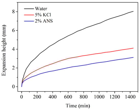 Shale is rich in clay minerals, and all types of clay minerals exhibit a strong affinity for water. Among them, montmorillonite, a type of layered clay mineral, possesses the greatest natural attraction to water due to the continuous expansion of its lattice structure. Bentonite, characterized by its abundant content of this mineral and low cost, is widely available. Therefore, it can be chosen as a suitable material for evaluating the hydration behavior of clay. The expansion inhibition test can reflect the ability of inhibitors to prevent clay hydration expansion. As shown in Figure 7, the test results of the expansion height for bentonite in different test fluids are presented. Specifically, the expansion height in deionized water increased rapidly with time, reaching 8.04 mm within 24 h. This implied that in deionized water, clay underwent thorough hydration. Therefore, this aspect should not be overlooked in studies on shale stability. In contrast, the reduction in expansion height was attributed to the effective inhibition of two inhibitors. The expansion heights decreased to 4.12 mm in 5% KCl and 3.13 mm in 2% ANS, respectively. With a smaller dosage, ANS achieved a lower expansion height compared to KCl. It was evident that ANS exhibited stronger hydration inhibition than commonly used KCl. This was due to its micro-nano dimensions, allowing it to plug shale pores and cracks, thereby reducing water infiltration into the shale. In addition, grafting APTES onto the surface of silica could offer prolonged clay stability. This was attributed to the abundance of amino groups, which could strongly electrostatically adsorb onto the clay surface. Consequently, only a reduced amount of water could penetrate the clay, achieving effective clay stabilization. The above analysis indicated that ANS demonstrated significant potential as a shale inhibitor.