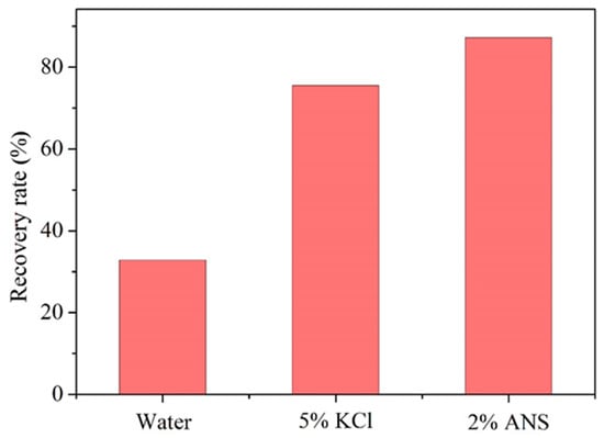 Shale, rich in clay minerals, exhibits strong hydrophilicity. Upon contact with water-based fluids, it easily weakens the bonding forces between shale particles, leading to shale dispersion and a subsequent reduction in strength, which is detrimental to wellbore stability. Additionally, since formations are often in high-temperature environments, the dispersion of shale under elevated temperatures becomes a focal point in studying its stability. A dispersion inhibition test is conducted to simulate the dispersion behavior of shale during drilling. Figure 8 illustrates the test results of the rolling recovery rate for shale in different test fluids. Specifically, the recovery rate in deionized water was very low, at only 32.84%. This result also confirmed the pronounced dispersibility of shale in water-based fluids. In contrast, the increase in the rolling recovery rate was attributed to the effective inhibition of two inhibitors. The recovery rates increased to 75.49% in 5% KCl and 87.22% in 2% ANS, respectively. With a smaller dosage, ANS achieved a higher shale recovery rate compared to KCl. This indicated that silica modified with APTES effectively controlled the dispersion of shale cuttings. It could be inferred that, due to the higher cationic density, the amine cations presented in ANS adsorbed more strongly to the shale surface. This resulted in a firm fixation of shale cuttings during the shale rolling recovery test, ensuring that shale cuttings remained intact. The test confirmed that the newly prepared ANS achieved a higher shale recovery rate compared to the commonly used KCl, suggesting its stronger inhibition properties that impeded the dispersion of shale cuttings. Therefore, ANS presented itself as a shale stabilizer with significant application potential.