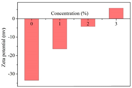 The interaction between shale inhibitors and clay typically affects the zeta potential of bentonite particles in aqueous dispersion. Therefore, it is necessary to investigate the impact of inhibitors on the electrokinetic properties of bentonite particles. The zeta potential of bentonite treated with different test fluids is illustrated in Figure 9. In deionized water, the zeta potential was −33.47 mV, indicating the complete dispersion of bentonite particles. The adsorption of ANS at different concentrations would impact the zeta potential of particles to varying degrees. As the concentration of ANS increased, its absolute value continued to decrease. This phenomenon was attributed to the interaction between the amine groups in ANS and the negative charges in bentonite [55]. In particular, when the ANS concentration reached 3%, the zeta potential changed from a negative value to a positive value, indicating a strong interaction with the clay [56]. The surface of silica modified with APTES was rich in amino groups. These amino groups underwent protonation in water, forming ammonium ions and thereby adsorbing onto negatively charged sites on clay through electrostatic attraction. Additionally, hydrogen bonds typically existed between amino groups and clay, further contributing to the reduction in the zeta potential [57,58]. In summary, ANS could strongly adsorb on the clay surface through electrostatic and hydrogen bonding interactions, neutralizing its negative charge, and therefore, reducing its hydration effect [59]. When the potential of bentonite particles decreased by 20%, typically, their hydration and expansion would be thoroughly suppressed. Therefore, the adsorption of ANS significantly weakened the tendency of clay hydration, consistent with the results of bentonite expansion and shale dispersion tests.