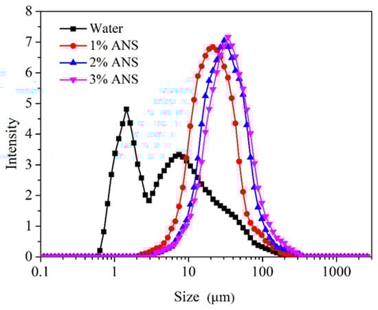 The particle size of clay particles to some extent reflects their hydration and dispersion state. Therefore, testing the impact of inhibitors on the particle size of clay particles can reflect their inhibition mechanism. The particle size of bentonite treated with different test fluids is depicted in Figure 10. In deionized water, the particle size was 4.89 μm. As the concentration of ANS increased, the average particle size continuously increased, shifting the particle size curves to the right. When the ANS concentration reached 3%, the particle size of bentonite had reached 32.27 μm. ANS nanoparticles adsorbed on the clay surface through amine groups [60]. The more ANS added implied more clay aggregation, leading to an increase in particle size [61]. This result was in good agreement with the zeta potential test result, confirming the hydration dispersion inhibition capacity of ANS. It also explained the mechanism behind the inhibition of clay hydration expansion and dispersion.