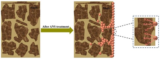 NS (99.8%), APTES (99%), ethanol (99.7%), ammonia (25–28%), KCl (99%) were purchased from the Aladdin Reagent Company (Shanghai, China). Sodium bentonite was provided by Yuancheng bentonite Company (Weifang, China). The shale sample used in this study was water-sensitive shale, and its mineral composition included quartz (42%), potassium feldspar (7%), plagioclase (15%), calcite (17%), and clay (19%).