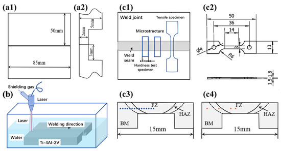 Schematic diagram for (a1,a2) welding specimens; (b) Ti-4Al-2V underwater wet laser welding; schematic diagram of (c1) sampling location and (c2) sample size for tensile tests; and locations for (c3) hardness tests and (c4) microstructure characterization.