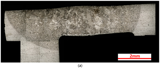 Figure 3 shows the cross-section metallographic morphology of the three welding joints. As shown in Figure 3a–c, a penetration depth of more than 2 mm can be achieved with a laser power of 3 kW. The boundary between the HAZ and the BM is obvious, and it shows a tendency to shrink from both sides to the center from top to bottom. However, the boundary between the FZ and HAZ is not so clear, but it can still be distinguished from the micromorphology; the grain size of the FZ is significantly larger than that of the HAZ. In addition, the columnar grains are the typical morphology in the FZ, as shown in Figure 3, and the grain growth direction at the edge of the FZ is perpendicular to the interface. The grain morphology in the HAZ is between the FZ and the BM, and the grains in the HAZ exhibit a gradient distribution from the FZ to the BM.