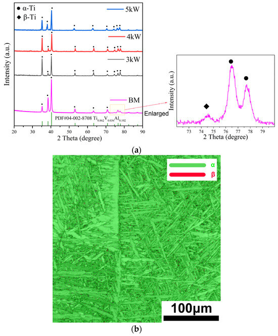 Phase composition characterization results of the FZ in a Ti-4Al-2V joint formed via underwater wet welding using varying laser power: (a) the XRD pattern, (b) the EBSD characterization results of a 3 kW joint.