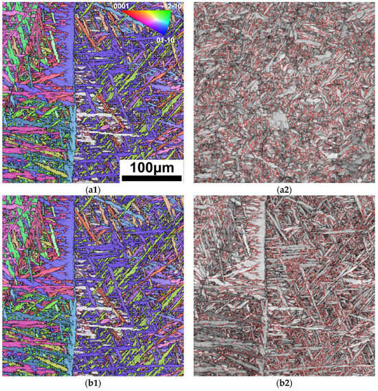 Figure 7 shows the Inverse pole figure (IPF) of the FZ and HAZ in the 3 kW joint, as well as the grain boundary distribution in corresponding areas. As shown in Figure 7(a1), the α phases show lath-like morphology with a small aspect ratio in the HAZ. In the represented field of view, the overall distribution of the α phase with different orientations is relatively uniform, but there are cluster features in specific areas. As shown by the red line in Figure 7(a2), 40% of the α-phase interface is 60°/<11–20>, far exceeding the random theoretical value—18.2%—indicating that there is a clear variant selection during the α phase precipitation, and Type-I clusters are mainly present [10].