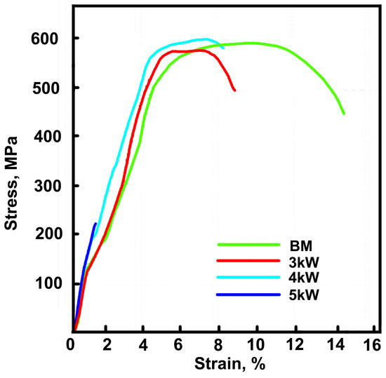 The room temperature tensile curves of different joints, as well as the BM, are shown in Figure 9, and the corresponding rupture stress and fracture elongation are listed in Table 1. It is important to point out that all of the samples avoided weld cracks. The deformation capability of the three joints is deteriorated, and the strength of the 3 kW and 4 kW joints equivalent compared with the BM. The 4 kW joint shows the best comprehensive performance with a tensile strength of 604 MPa and fracture elongation of 7.14%, respectively. The performance of the 3 kW joint is accepted, but the 5 kW joint shows obvious brittleness without plasticity. The yielding stress is difficult to detect in the tensile curves, because there is no obvious yield plateau and the curves are not smooth enough. However, different joints exhibit similar tensile deformation behavior before fracture, according to the curves shown in Figure 9.