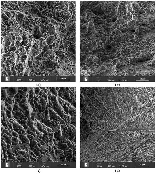 Figure 10 shows the tensile fracture morphology of the BM and the three joints. In the morphology of the BM, 3 kW and 4 kW joints, a typical ductile fracture occurs with obvious ductile dimples. The fracture dimples of the 3 kW and 4 kW joints is smaller and shallower compared with the BM, which is in line with the lower fracture elongation. There are obvious tearing edges in the fracture surface of the 5 kW joint, which is a typical brittle fracture.