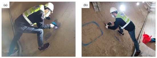 Pull-off test between polyurea coating and concrete lining substrates in the tunnel. (a) Cutting polyurea on site. (b) Pull-off test.