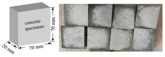 The prism concrete specimens (Figure 2) were prepared with dimensions of 70 mm × 70 mm × 20 mm for the spraying polyurea coating, aiming to conduct the pull-off test. Commercial composite Portland cement P.O.42.5 was used in the specimens, with medium sand (fineness modulus between 2.3 and 3.0) and 5–10 mm diameter crushed stones mixed with pure water. The specimens underwent standard curing conditions (20 ± 2 °C, 95% relative humidity) for a duration of 28 days. The mix ratio of the concrete specimens was cement: water: sand: crushed stone: water reducer at 2.88:1:6.33:5.17:5.2%. Subsequently, the concrete surfaces were dried at 60 °C for 48 h until the moisture content dropped below 8%, following which the polyurea material was sprayed for pull-off testing (Figure 3).