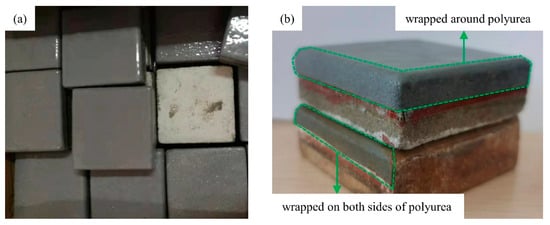 Concrete specimens after spraying polyurea elastomer. (a) The top surface of the concrete sample sprayed with polyurea coating. (b) The side of the concrete sample sprayed with polyurea coating.
