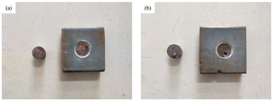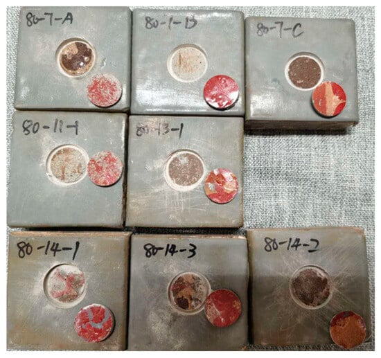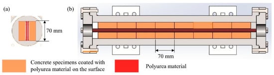 The apparatus replicates the conditions of a water conveyance tunnel, facilitating accelerated specimen aging through temperature elevation (Figure 4b). This device can examine the variation in cohesive strength of polyurea specimens under a composite influence of temperature, dynamic water flow, and pressure. The testing apparatus consists of a water tank, two constant water pumps, an aging test chamber, a cooling water tank, a temperature measurement, a flow meter, two pressure gauges, and a control device. To fulfill the demands of prolonged continuous operation, two constant water pumps operate alternately. A heating device and a temperature sensor were incorporated into the water tank to elevate the temperature and expedite specimen aging. Aligned with the real water flow conditions of a water conveyance tunnel in Henan Province, the test apparatus can simultaneously simulate aging environments with varying water pressures of up to 0.65 MPa (with a maximum water temperature reaching 80 °C). Concrete specimens coated with polyurea material on the surface, each measuring 70 mm by 70 mm by 20 mm, were positioned on both sides of the unit, with a polyurea material placed in the middle (Figure 5). During the experiment, water was heated to the designated temperature in a water tank. A water pump was used to continuously circulate water with a certain pressure and flow rate into the aging test chamber, simulating the operating conditions of a real water delivery tunnel.