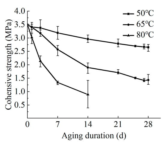 This section presents the experimental results of aging tests under a simulated on-site environment. The effect of aging on cohesive strength is shown in the following figure (Figure 7).
