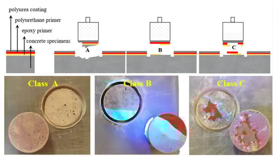 To aid in understanding the failure mechanisms, Figure 8 defines and summarizes the various failure types observed during the aging tests. Based on the different bond failure types observed after cohesive strength measurement, the specimens can be classified into three categories: A, B, and C. Type A damage can be summarized as cohesive failure between concrete and epoxy resin, type B damage can be summarized as interfacial failure between the epoxy resin and polyurethane primer, and type C damage can be summarized as interfacial failure between polyurea and primer.