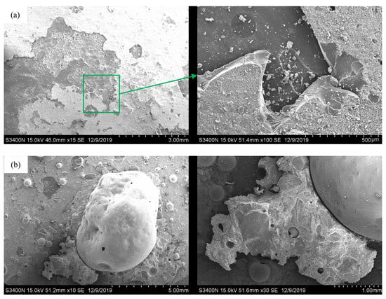 Following pull-off strength testing, scanning electron microscopy (SEM) was employed to analyze the microscopic morphology of the fractured interface. The interfacial analysis after exposure to Case 3-8 is depicted in the following figures (Figure 11a and Figure 12a). Post-fracture analysis revealed the presence of residual epoxy resin and polyurethane undercoating on the concrete base surface. Microscopic magnification clearly visualized the coating and fracture texture (Figure 11b). A specimen from the test Case 3-1 observed that there were obvious defects on the concrete surface (Figure 11b). Preexisting defects necessitated epoxy resin repair before spraying. The fractured interface displayed visible epoxy resin and concrete, with the repair material completely filling the defect. High magnification revealed the epoxy resin–concrete interface with small adhering concrete fragments. The bond strength measured for this repaired specimen exhibited a slight increase compared to the standard test group under the same aging conditions. These findings suggest the potential utility of epoxy resin for mitigating concrete surface defects and enhancing the contact area, thereby improving the bond strength between the epoxy resin and the concrete surface.