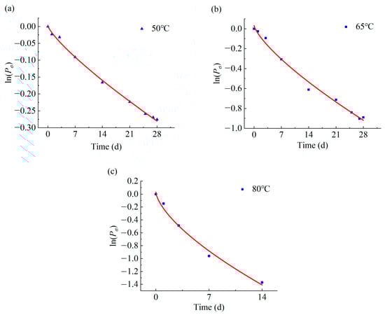 This study employs artificial accelerated aging to simulate the effects of temperature, water pressure, and water flow on the cohesive strength and bond failure types between polyurea coating and concrete linings. Drawing on the test data in Section 3.2.2, this section predicts the polyurea’s service life for the project to guarantee operational safety. Kinetic equations, often expressed as exponential functions (Equation (1)), have been successfully employed to describe the relationship between aging performance (P) and aging time (t) for similar polymeric materials []. We will utilize this approach to predict the service life of the polyurea material.