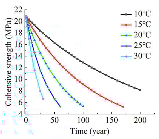 According to the specification GB/T 23446-2009 [], the bond strength of polyurea must exceed 2.5 MPa. The critical value of bond strength was set at 50% of this value. The critical value of cohesive strength was also set at 1.25 MPa. After fitting, the parameter substitution Equation (5) was obtained, as shown in Figure 14. If the annual average temperature of the water conveyance tunnel is 15 °C, the estimated service life of the polyurea coatings is approximately 16.52 years.