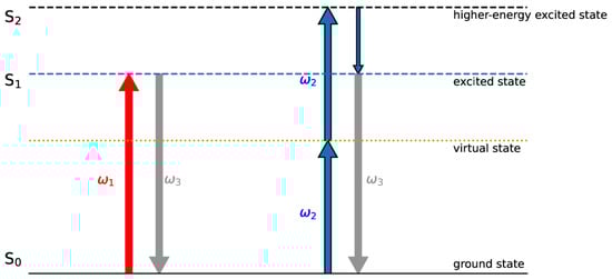 As shown in Figure 1, in order to induce polymerization, it is necessary to drive the photoinitiator in an excited state. On the left side, one-photon absorption (OPA) is shown, in which the excited state is reached directly with the absorption of a single photon. On the right side, the two-photon absorption (TPA) excitation process is shown: This process can take place only in a limited region, with a high photon density, enabling high printing resolutions. S0 is the ground state, and S1 is an excited state reached directly via OPA or indirectly via TPA, through a short-lived higher-energy state (S2) and a subsequent non-radiative decay to S1. Incident light frequencies are denoted as ω1 and ω2 for OPA and TPA, respectively; ω3 is a fluorescent emission frequency.