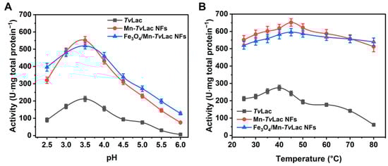 The free and immobilized TvLac pH profiles were assessed over a range of 2.5–6.0 in a buffer solution. Free TvLac had an optimum pH of 3.5 (Figure 3A). After being immobilized as magnetic NFs, a shift in the optimum pH from 3.5 to 4.0 was observed for immobilized TvLac as Fe3O4/Mn-TvLac and Mn-TvLac NFs. In contrast, no change in the optimal pH was recorded for free laccase and its NFs based on Co and Cu [39,41]. The Fe3O4/Mn-TvLac and Mn-TvLac NFs showed better activity profiles than those of free TvLac at lower and higher pH values of 2.5 and 6.0, respectively, under optimal conditions. Under these pH conditions, Fe3O4/Mn-TvLac and Mn-TvLac NFs showed up to 1.9- and 14.2-fold higher residual activity than the TvLac with values of 42.5% at pH 2.5 and 2.8% at pH 6.0, respectively. Previously, similar pH profiles were reported for free and Cu-NFs-based laccase [41]. A similar shift in the temperature-activity profiles of the Fe3O4/Mn-TvLac and Mn-TvLac NFs was observed over that of free TvLac (Figure 3B). Optimal temperature values of 40 °C for free TvLac and 45 °C to immobilized TvLac as Fe3O4/Mn-TvLac and Mn-TvLac NFs were measured. In contrast, a similar optimum temperature value was noted for free and immobilized laccase NFs synthesized using Cu and Co ions [41,45]. Another study on laccase immobilization using metal-organic frameworks showed analogous optimal temperature values for free and encapsulated enzymes [46]. Further, an increase in temperature above the optimum values resulted in the continual decline of the residual activity of TvLac up to 80 °C. At 80 °C, the TvLac, Fe3O4/Mn-TvLac, and Mn-TvLac NFs retained residual activities of 22.4%, 78.6%, and 90.6%, respectively. The Mn-based NFs displayed a wide pH and temperature activity profiles compared to the corresponding free TvLac. Above results imply that encapsulating partially purified TvLac through magnetic nanoparticles and Mn-based inorganic-protein hybrids could be more advantageous for shifting pH and temperature optimal values than when immobilizing purified-laccase using Co- or Cu-based NFs [39,41,45].