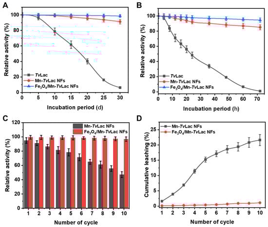 After successive recycling, the activities of Fe3O4/Mn-TvLac and Mn-TvLac NFs were reduced (Figure 4C). For the Mn-TvLac NFs, a decline in residual activity to 78.4% and 47.1% was observed after five and 10 reuse cycles, respectively. Under similar recycling conditions, Fe3O4/Mn-TvLac retained much better residual activities of 98.7% and 96.8%, respectively. Under various recycling conditions, an immobilized system based on purified laccase exhibited residual activities of (i) ~50% after 10 cycles for Co-based, and dendrimer-grafted silica-coated hercynite-copper phosphate magnetic NFs [39,47], (ii) 25–40% after five cycles for ferrite microparticles based on Ni-Zn and Ni-Zn-Co [49], (iii) 30% after 10 cycles for Cu-based NFs [45], and (iv) 40% after 12 cycles for Zn-based NFs [41]. During the reusability test, successive decreases in the immobilized laccase residual activity of Mn-TvLac can be linked to the leaching of bound enzymes or their inactivation due to the deformation of the NF matrix [18,40]. Further, higher cumulative leaching is confirmed by higher structural deformation in Mn-TvLac than Fe3O4/Mn-TvLac (Figure S7). The high reuse stability of Fe3O4/Mn-TvLac was validated by its remarkably low cumulative leaching of 1.1% compared to the 21.6% of Mn-TvLac (Figure 4D).