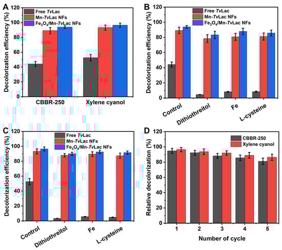 To investigate the prospective application of free and immobilized TvLac as Mn-TvLac and Fe3O4/Mn-TvLac NFs, the decolorization of CBBR-250 and xylene cyanol was evaluated at 25 °C during a 48 h incubation period and under agitation (100 rpm). The decolorization of dyes was enhanced with an increase in the incubation period up to 48 h (Table S5). Subsequently, the decolorization efficiency stabilized after 72 h of incubation. Incomplete decolorization may be associated with enzyme inactivation or substrate inhibition. In contrast, Fe3O4 nanoparticles and heat-inactivated Fe3O4/Mn-TvLac, used as controls, showed less than 1% dye decolorization, which could be associated with their inherent properties for dye adsorption. Free TvLac showed decolorization efficiencies of 44.2% and 52.7% for CBBR-250 and xylene cyanol, respectively (Figure 5A). Under similar incubation conditions, the Mn-TvLac NFs exhibited higher decolorization efficiencies (89.2% for CBBR-250 and 93.3% for xylene cyanol), whereas a maximum decolorization of 93.9% and 96.5% for CBBR-250 and xylene cyanol was observed by Fe3O4/Mn-TvLac NFs, respectively. Previously, lower decolorization efficiencies were reported in the range of 5–40% for Coomassie Brilliant Blue by Aspergillus oryzae-, Paraconiothyrium varia-bile-, and T. versicolor-based laccases [53]. In contrast, a low 36% decolorization of Coomassie Brilliant Blue by immobilized laccase from Myceliophthora thermophila on epoxy-functionalized silica was observed over free laccase with a value of 53% under similar reaction conditions [54]. Xylene cyanol decolorization of up to 35% was demonstrated using Phanerochaete chrysosporium-based lignin peroxidase combined with glucose oxidase in the presence of external hydrogen peroxide [55]. Similar dyes such as Brilliant Blue X-BR and Remazol Brilliant Blue R have been used for free and immobilized TvLac on chitosan beads [56]. Dithiothreitol, Fe(II) ions, and l-cysteine are well-known potent inhibitors of laccase that can potentially inhibit laccase bioremediation during waste treatment [36,57]. Therefore, decolorization of these dyes was assessed in the presence of these inhibitors. A remarkable decline in the decolorization efficiency from 44.2% to 4.5% for CBBR-250 and from 52.7% to 3.3% for xylene cyanol by TvLac was observed in the presence of these potent laccase inhibitors (Figure 5B,C). In contrast, Mn-TvLac and Fe3O4/Mn-TvLac retained excellent residual decolorization efficiencies of up to 87.9% for CBBR-250 and up to 92.5% for xylene cyanol. Furthermore, repeated batch decolorization of these dyes occurred when using Mn-TvLac and Fe3O4/Mn-TvLac NFs in the presence of 0.1 mM Fe(II). After five reuse cycles, Mn-TvLac and Fe3O4/Mn-TvLac retained residual decolorization efficiencies of up to 81.1% and 86.3% for CBBR-250 and xylene cyanol, respectively (Figure 5D). Previously, a low Brilliant Blue decolorization of 63.2% was reported for TvLac immobilized on lectin-modified cryogels [58]. These findings suggest that the immobilization of TvLac using magnetic nanoparticles and Mn metals as inorganic protein hybrid NFs is beneficial for retaining a high decolorization efficiency in the presence of enzyme inhibitors.
