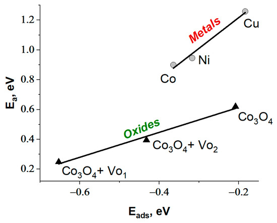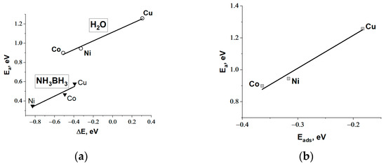 It was additionally shown that there is a relationship between Eads and Ea for breaking the O-H bond in the water molecule (Figure 1b). This is consistent with the Sabatier principle [44], which states that the adsorption energy of water molecules on the catalyst surface should be strong enough to allow for easier water dissociation. At the same time, the adsorption energies of the intermediates (OH*, H*) should be optimal to ensure their further transformation with the release of active centers for further adsorption of reagents. This relationship is common in DFT calculations for water dissociation. The comparison of the DFT results of this work with literature data for different metal surfaces is presented in Figure S3a.