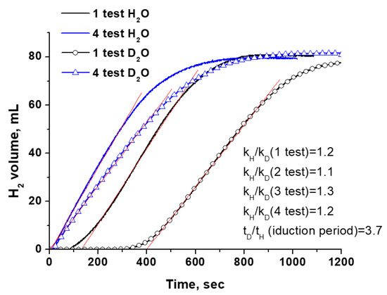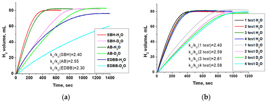 The KIE measurement using isotopically labeled reagents is a widely used experimental technique to reveal the RDS. The results on KIE for catalysts containing metal active components have mostly been investigated in processes (1) and (2). They have shown that for the hydrolysis of both SBH and AB, a primary isotopic effect (kH/kD > 2) is observed when the reaction takes place in deuterated water, and a secondary KIE is noted with isotope-labeled hydrides [43,46,47]. Our tests of the Co0 catalyst in heavy water are shown in Figure 2a. As expected, there is a slowdown in the hydrogen evolution rate. For all studied hydrides, kH/kD > 2 (shown in Figure 2a) is obtained, indicating the direct formation of the deuterium bond in the structure of the activated complex. This observation supports the idea that the dissociation of water (5) can be considered as the RDS when using metallic cobalt as a catalyst. This is consistent with the DFT results and the literature data for other metal catalysts (Table S1).