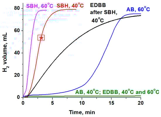 The SBH, AB, and EDBB hydrolysis was carried out at 40 °C under 750 rpm stirring. First, 10 mL of distilled water was added into a glass reactor (V = 52.5 mL) and preheated to the required temperature; then, the hydride and the catalyst powder were added in succession. The reactor was sealed, and the evolving hydrogen was passed through a condenser to the gas burette (100 mL) equipped with digital pressure Sendo sensor SS312 (Sendo sensor, Shenzhen, China). The tested amount of hydride sample was 35 mg (0.925 mmol) for SBH, 38 mg (1.23 mmol) for AB, and 54 mg (0.615 mmol) for EDBB. In all cases the initial concentration of B-H bond in the reaction medium was 3.7 mmol in 10 mL of solution. In all experiments, the amount of catalyst was 11.7 mg. The obtained values of hydrogen volume were reduced to the N.T.P.