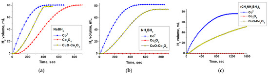The comparison of activity of Co0, Co3O4, and CuO (10 wt%)-Co3O4 in the hydrolysis of (a) NaBH4, (b) NH3BH3, and (c) (CH2NH2BH3)2 at 40 °C.