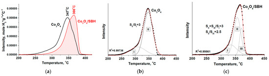 It is well known [33] that the traditional Co3O4 reduction process is in two stages: (I) the low-temperature wide peak corresponds to the reduction phase of Co3+ to Co2+, and (II) the high-temperature narrow peak corresponds to the reduction of Co2+ to Co0 (Figure 7b). For the Co3O4 stoichiometry, the ratio of the peak area II to the peak area I must be three, which we have confirmed in our experiment for initial Co3O4. The deconvolution of the TPR H2 spectrum of the activated Co3O4/SBH (Figure 7c) is different. In this case, the higher temperature hydrogen consumption is described more precisely by the three peaks. Two high-temperature peaks (II and III) can be expected to be attributed to the reduction in two Co2+ states. For the initial Co3O4, the amount of hydrogen consumed for the reduction was 1.25 × 10−2 mol/g. This corresponds to the calculated Co3O4 reduction degree of 75%. The loss of oxygen during Co3O4 reductive treatment with SBH solution is low, as the amount of hydrogen consumed during reduction in this sample has decreased only by 9 rel%.